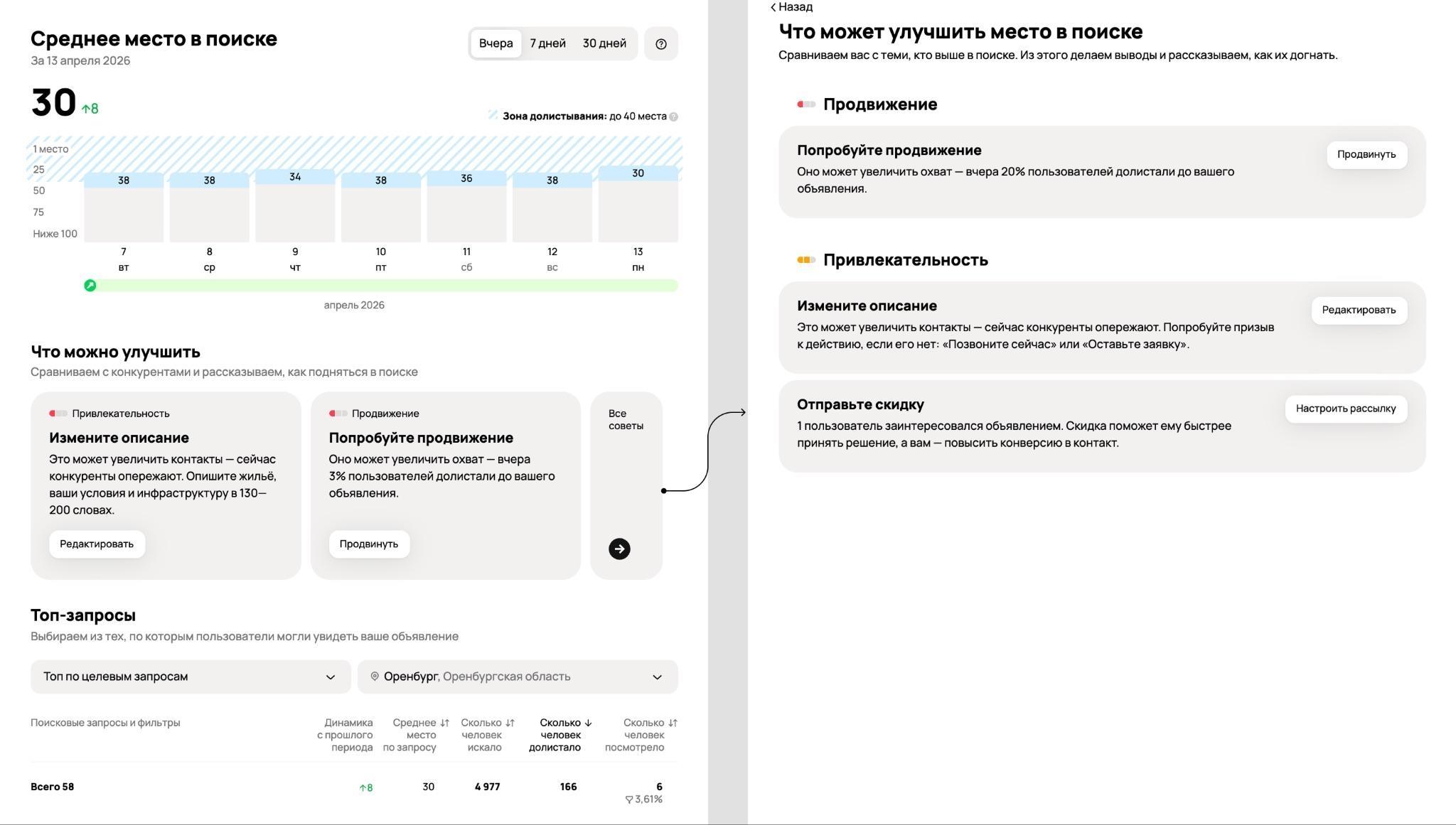 "Среднее место в поиске" показывает, на каких позициях находятся объявления, как эта позиция меняется со временем и доходят ли до объявлений пользователи при просмотре выдачи. Например, если объявление находится ниже зоны, до которой долистывают пользователи, система прямо укажет на это и предложит продавцу конкретные действия: доработать объявление, предложить покупателям скидки или усилить продвижение.